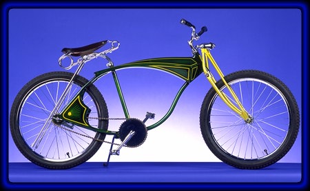 uxury owrider Diamond Raked and modified Schwinn frame.Schwinn springer fork. Green and lime gold candy colors over silver basecoat. Front and rear 24" wheels.Antique style saddle. Selling Price $ 700.00To Order From Luxury Lowrider E-Mail with what you would like to order and your full postal address to bike@luxurylowrider.comQuestions / Services/ Inquiries / Terms |
