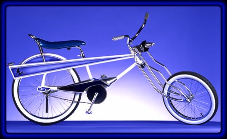 uxury owrider Space Chopper Raked buzz frame with fiberglass composite body. Color scheme blue candy over abalone flake base.Lux Low custom chopper suspension fork.24" back wheel with coaster brake and 20" front wheel.