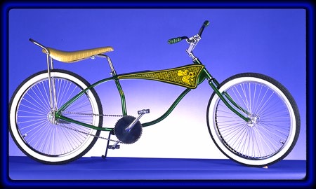 uxury owrider Bee bike Raked, squashed,and stretched Schwinn frame. Green candy color over silver base with custom printed Bee decals.Front and rear 24" 72 spoke baby dayton wheels. Selling Price $ 1000.00To Order From Luxury Lowrider E-Mail with what you would like to order and your full postal address to bike@luxurylowrider.comQuestions / Services/ Inquiries / Terms |