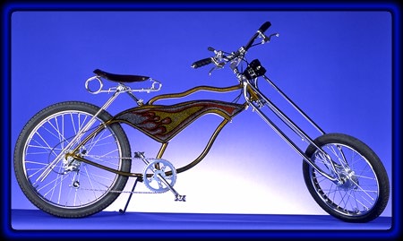 uxury owrider Flame Chopper Highly modified Schwinn frame. Custom Lux Low chopper fork. Candy colors over smoke flake base. 6 speed derailer system. Front wheel 20" with drum brake - Rear wheel 24" with drum brake.Antique style saddle. |