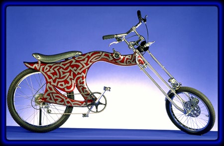 uxury owrider Tribal Chopper Highly modified steel frame with fiber glass composite shell.Lux Low custom chopper suspension fork.6 speed derailer system with built in stick shift.24"rear wheel with drum brake and 20" front wheel with disc brake.Paint scheme candy colors over smoke flake base.